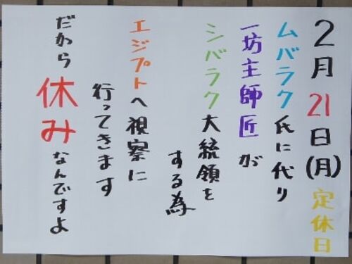 ムバラク氏に代わり 一坊主師匠が シバラク大統領をする為 エジプトへの視察に 行ってきます だから休みなんですよ ■ちょいめし あさチャン(2月21日お休みの理由より)じゃあ、その次は私がジダラク(自堕落)大統領になりたいと思います!