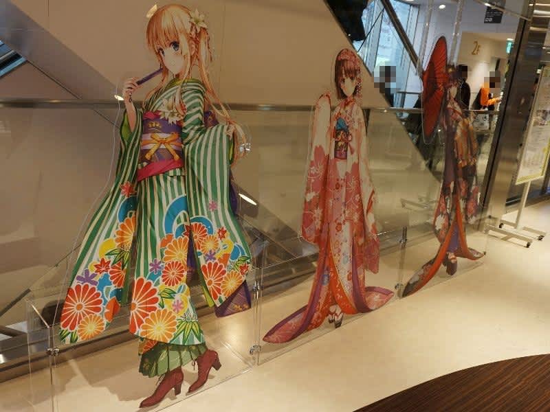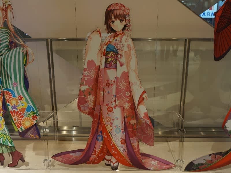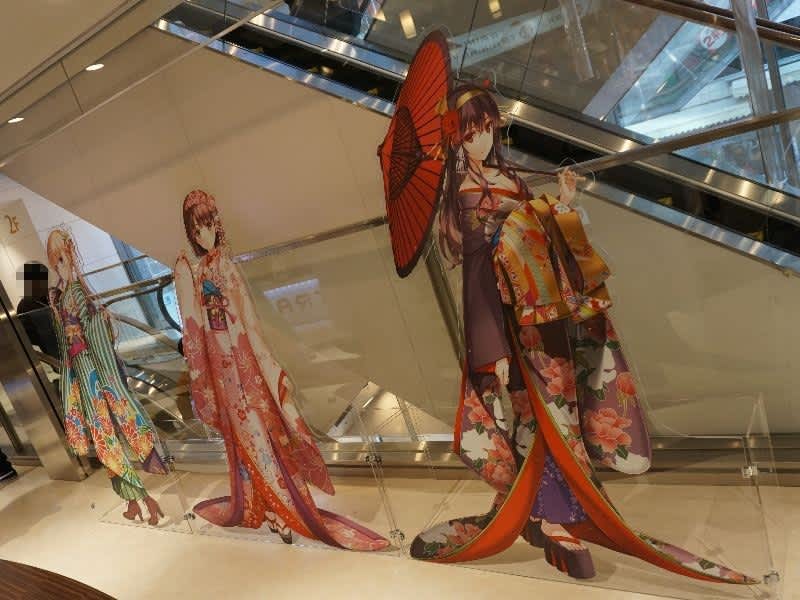 2階のエスカレーター近くには着物姿の加藤恵、澤村・スペンサー・英梨々、霞ヶ丘詩羽の3人が並んでいます。