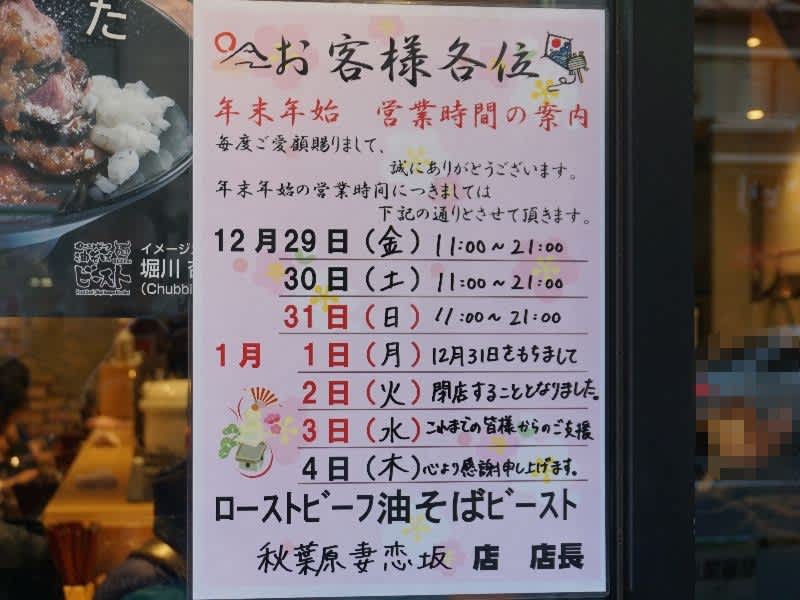 2017-12-31 外神田3丁目の「ローストビーフ油そばビースト秋葉原妻恋坂店」が閉店 グルメ(アキバ・ポンバシ) アキバからっ!(・△・)/ 外神田3丁目、昌平橋通りの「ローストビーフ油そばビースト秋葉原妻恋坂店」が12月31日の営業をもって閉店となった。 2016年9月7日のオープンから約1年4ヶ月営業されていました。 秋葉原エリアからは店舗が無くなりますが、歌舞伎町の本店を始め東京に4店舗が継続営業されています。 ■ローストビーフ油そばビースト秋葉原妻恋坂店 ■住所:東京都千代田区外神田3-6-5