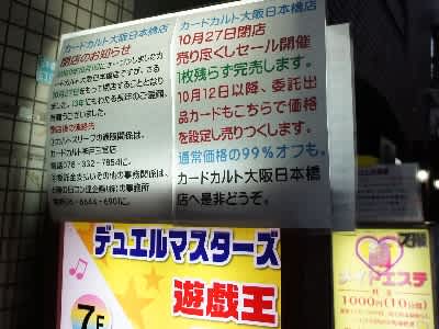 2013-10-27 日本橋5丁目のトレカ専門店「カードカルト大阪日本橋店」が閉店 オタ系(アニメ、ゲーム、玩具など) ぽんばしわっ!(・△・)/ 日本橋5丁目のトレーディングカード専門店「カードカルト大阪日本橋店」が10月27日の営業をもって閉店となった。 2000年10月から13年間営業していたそうです。 ポンバシエリアでは3年ほど前まで難波中2丁目にも店舗がありましたが、以降は大阪日本橋店のみとなってました。 店内に併設されていたメイドエステも閉店とのこと。 ■カードカルト大阪日本橋店 ■住所:大阪市浪速区日本橋5-11-7第1片倉ビル7F 【関連記事】 ・難波中2丁目のカードカルト南海難波駅前店がメイドエステになってる(2010-12-28)