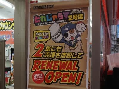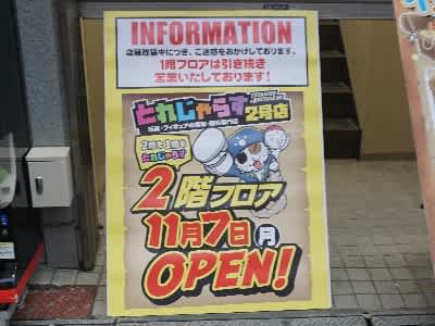 日本橋4丁目のおもちゃ屋さん「とれじゃらす2号店」が同ビル2階の「アニマックスCAFE」跡に売場を増設してオープンをするそうで、告知が掲示されていました。